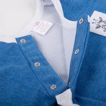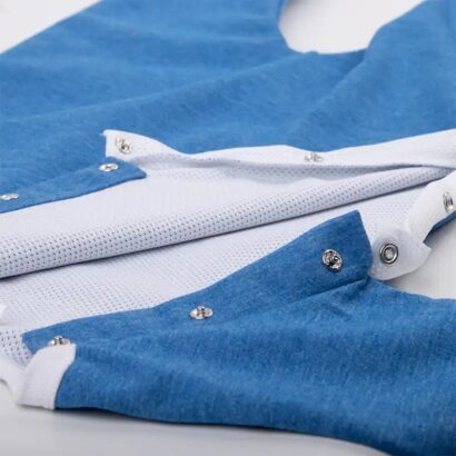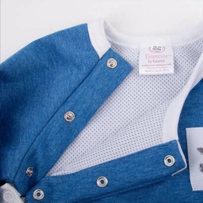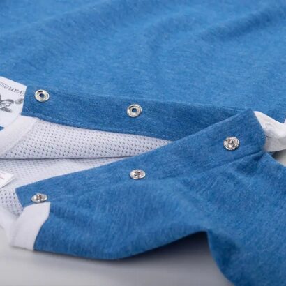 The striking blue color of the baby grow adds a touch of vibrancy and charm, while the contrasting white trim adds a delightful visual accent. Whether it’s a casual day out or a special occasion, your baby will look absolutely adorable in this stylish outfit.